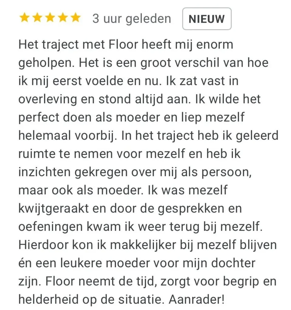 Debbie klopte bij mij aan op een moment dat ze zichzelf compleet verloren was. Ze stond continu aan en was compleet de verbinding met haar eigen behoeftes verloren (het avondeten kiezen voelde al als een berg beklimmen) – pleasen was niet nieuw voor haar maar kwam in het ouderschap in een 2.0-variant naar voren. Toevallig heb ik haar vorige week blij, energiek en opgelucht de deur uit zien lopen. Ze voelt wat ze wil, ze kiest voor zichzelf en voelt weer het vertrouwen. En het mooiste? Doordat zij weer in haar kracht staat, kan ze weer echte connectie maken met haar dochtertje.